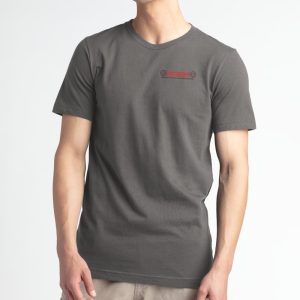Double sided in gray with the logo on the top front left and Eagle and flag logo on the back of the shirt. 100% cotton and silk screened.